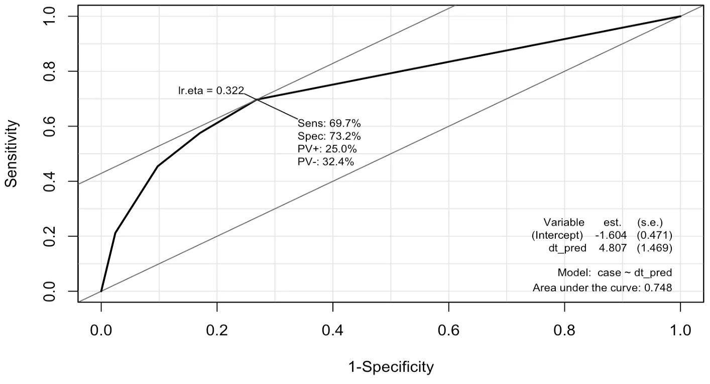 > dtree_ROD <- ROC (form=case~dt_pred, data=testData, plot='ROC')