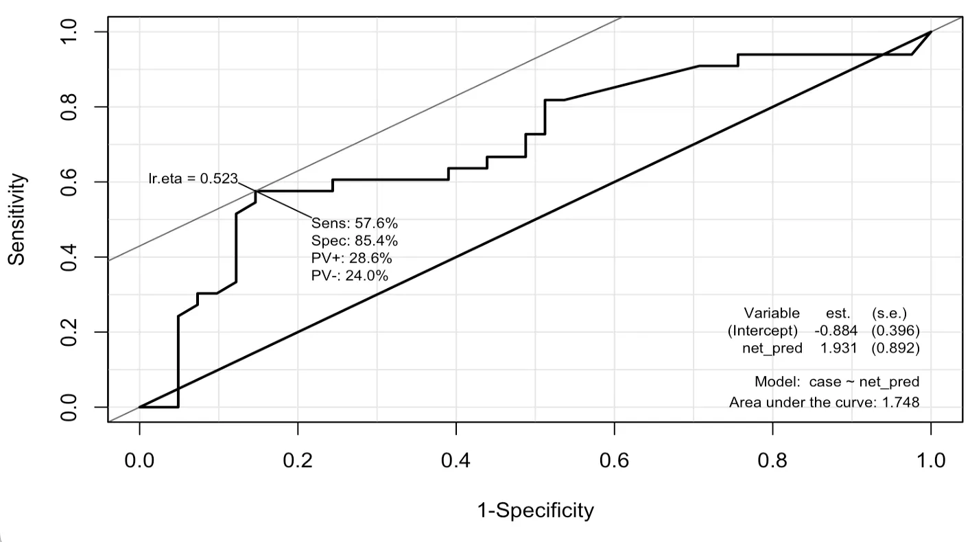 > neural_ROC <- ROC(form=case~net_pred, data=testData, plot='ROC')