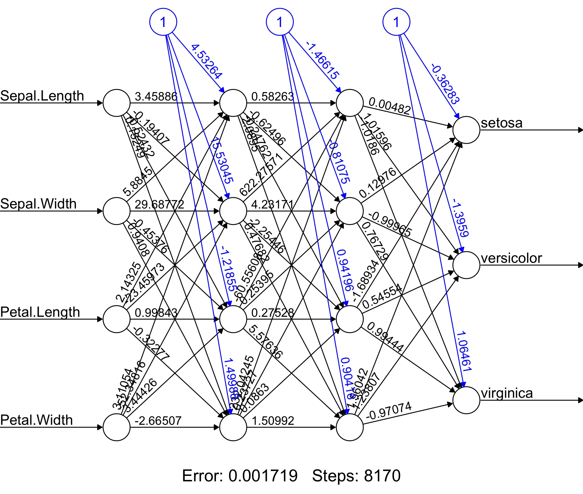 > net.infert<-neuralnet(case~age+parity+induced+spontaneous,data=trainData,hidden=3,err.fct='ce',linear.output = FALSE,likelihood=TRUE)