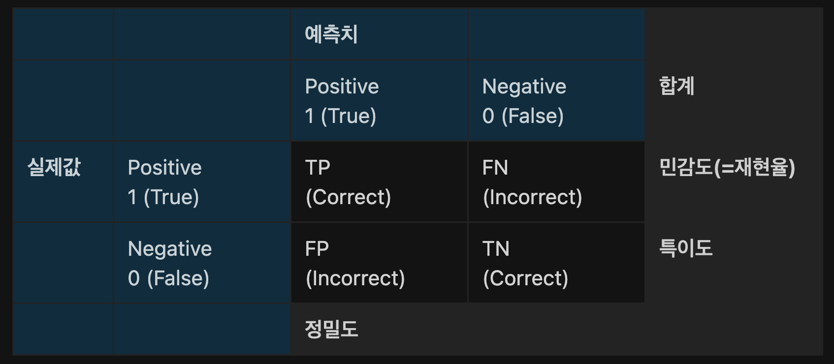 1. 정확도 (Accuracy) : 예측 True 중 올바르게 True를 찾아낸 비율