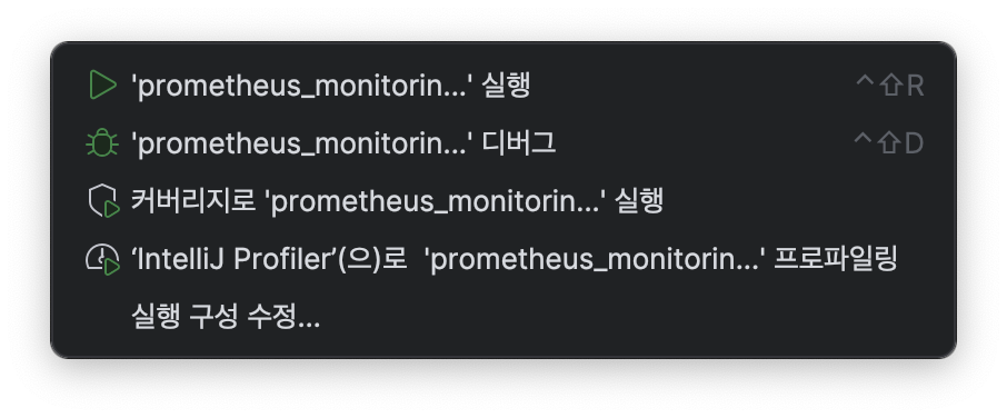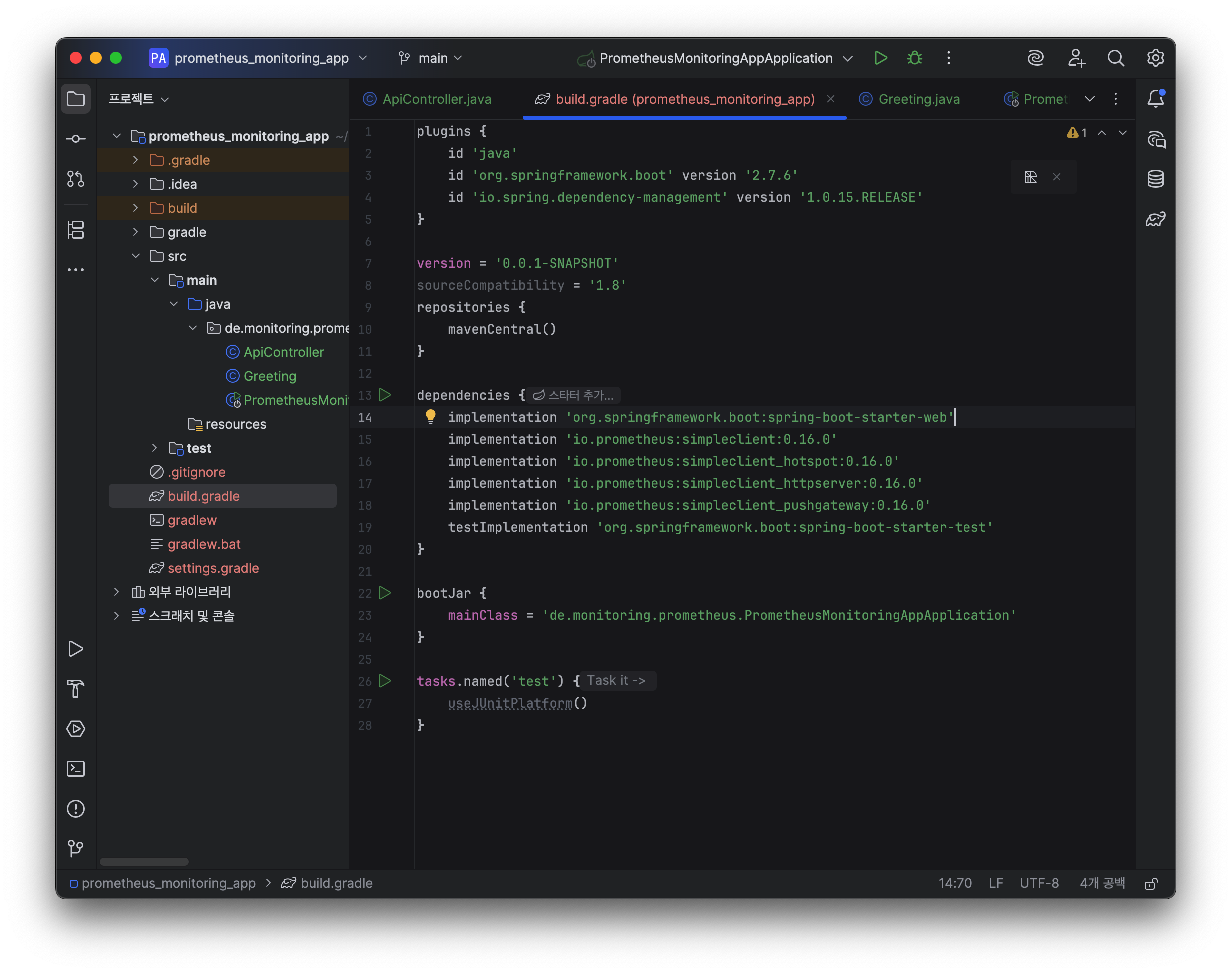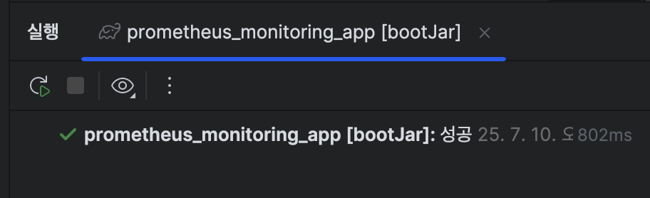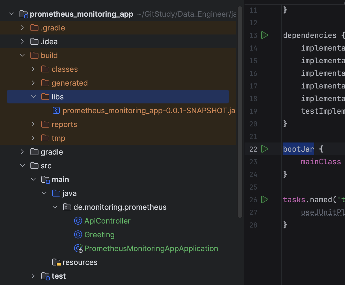 패키지는 de.monitoring.prometheus로 구성하였고, 메인 클래스는 PrometheusMonitoringAppApplication이다. 이 메인 클래스를 Gradle의 bootJar 플러그인에서 사용하는 mainClass 속성에 미리 지정해두면, 빌드 시 해당 클래스를 기준으로 실행 가능한 JAR 파일을 생성한다. 이를 통해 애플리케이션 실행 시 명확한 진입점을 설정할 수 있다.
