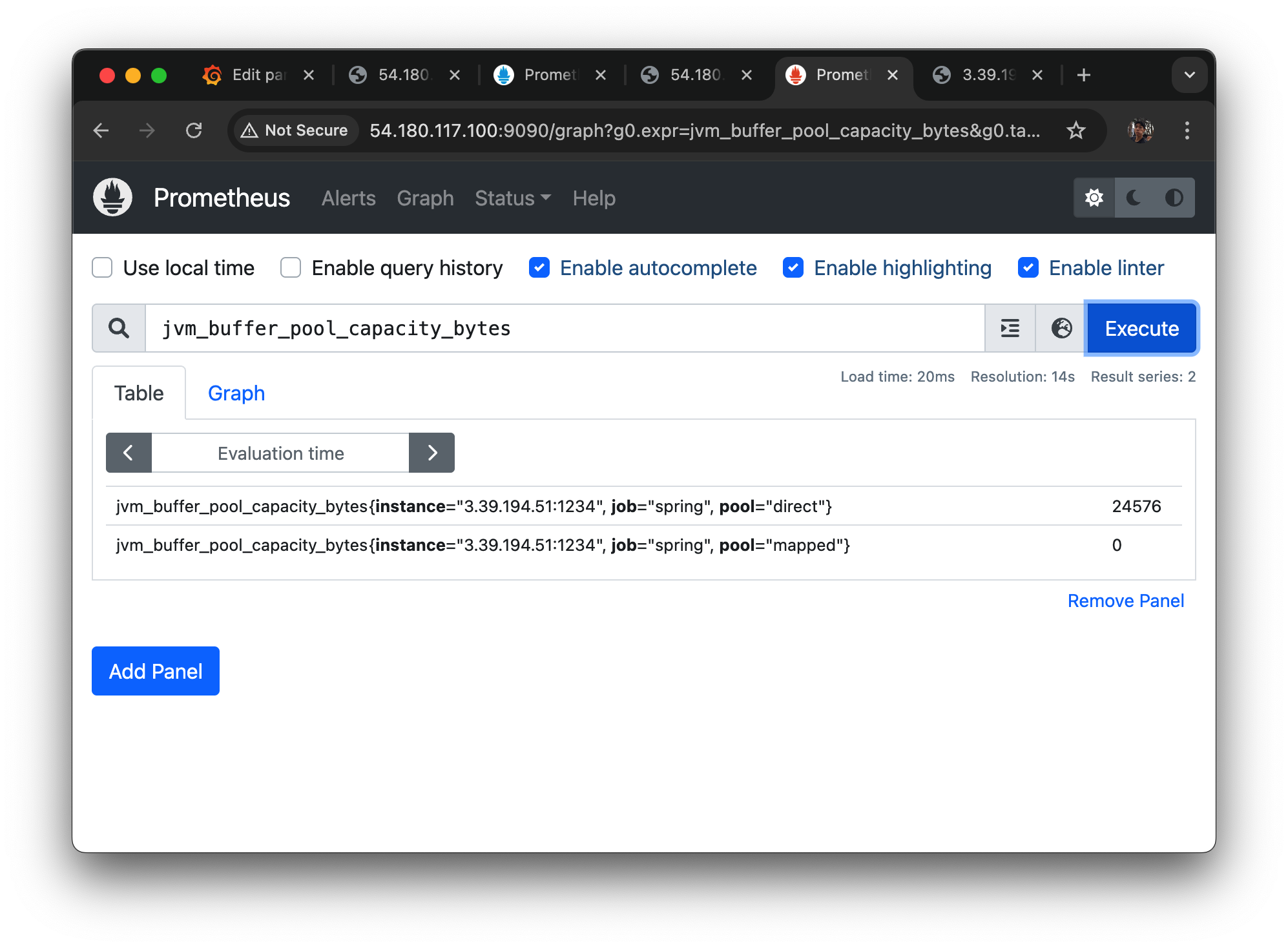 job: spring 의 새로운 job을 만든다. 여기서 사용하는 endpoint 는 app server 에서 노출한 별도의 prometheus endpoint이다.
