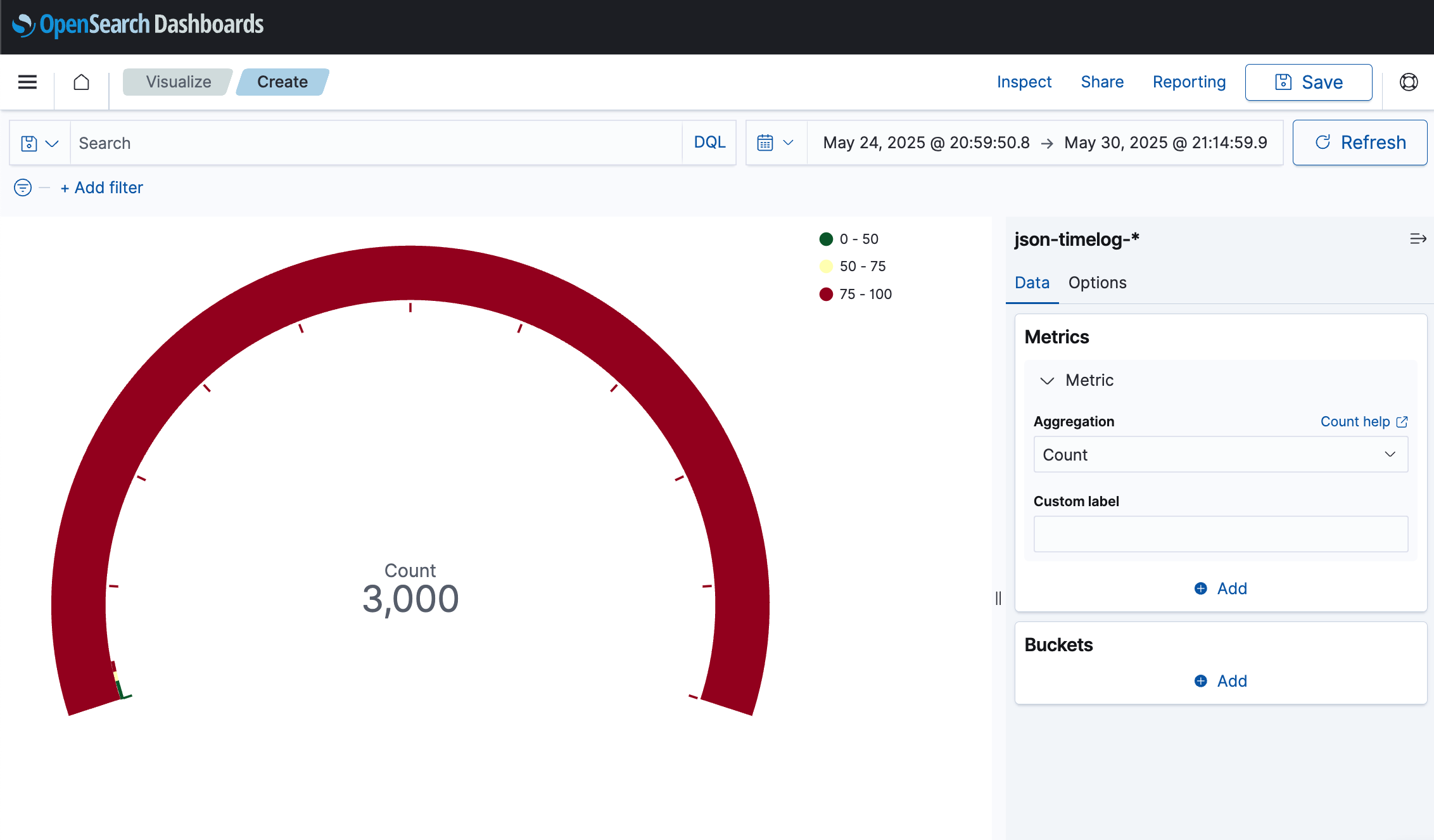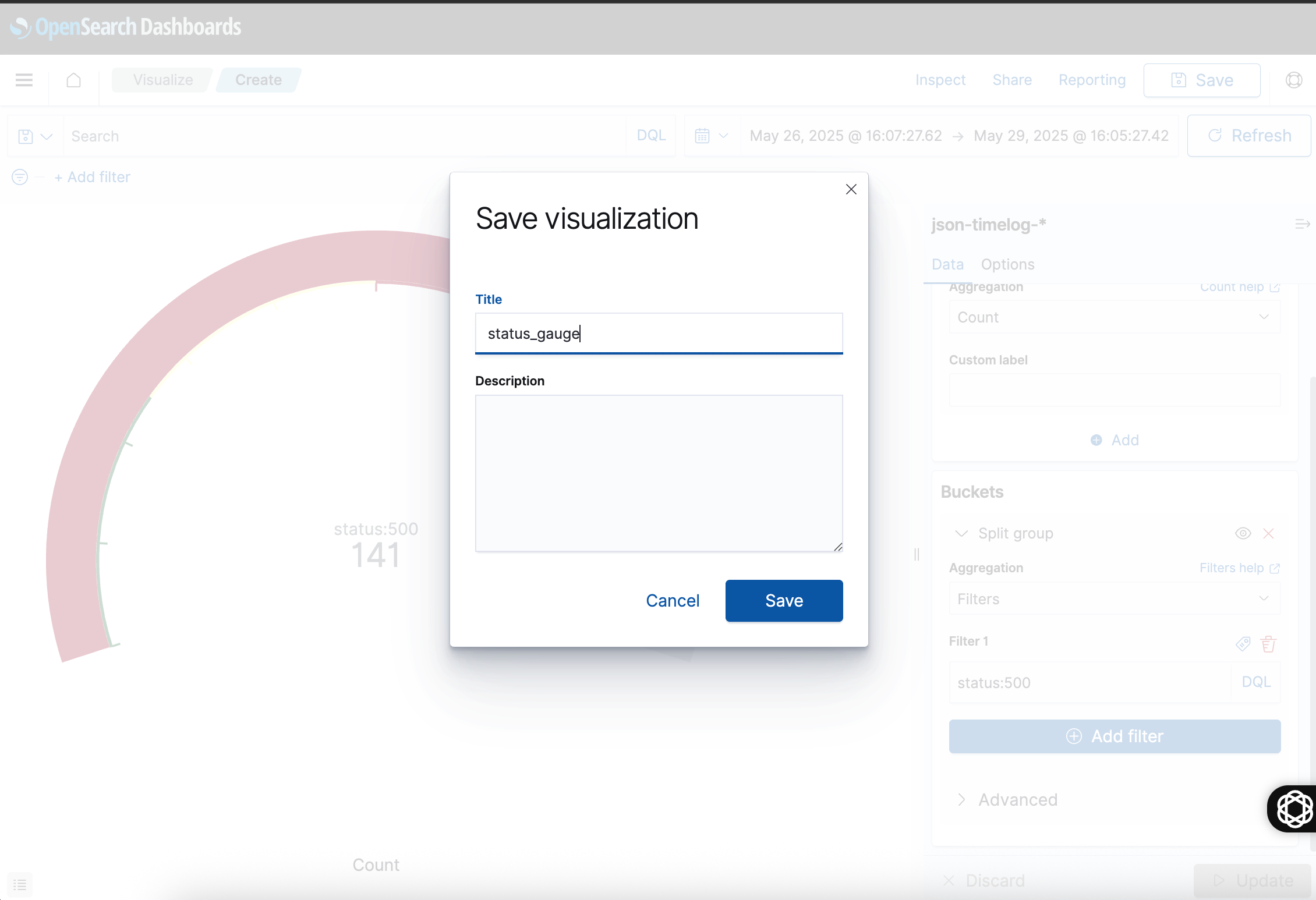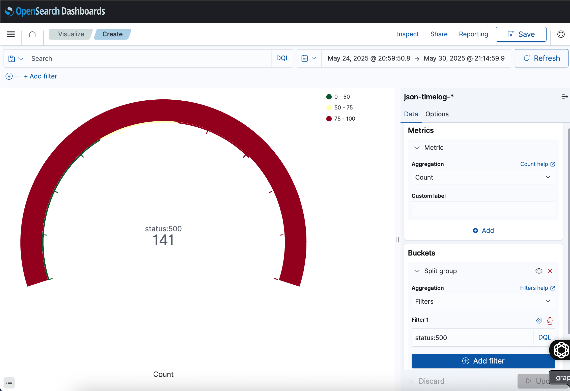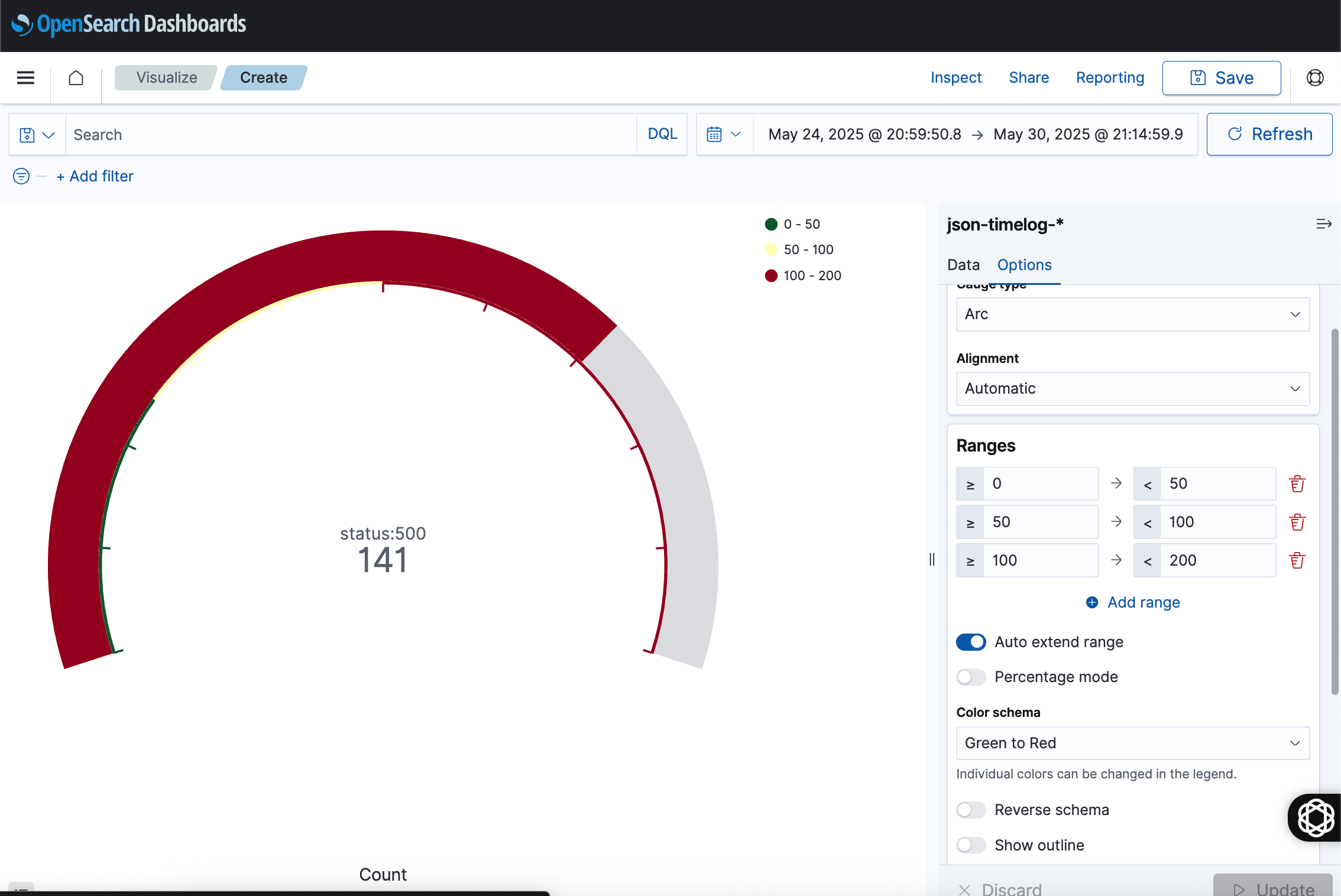 그러면 status 500이 141 개고, (범주를 넘어섰지만) 빨간색을 보여주는 모습이다. 옵션에 가서 범주의 범위를 바꿔줄 수 있다.
