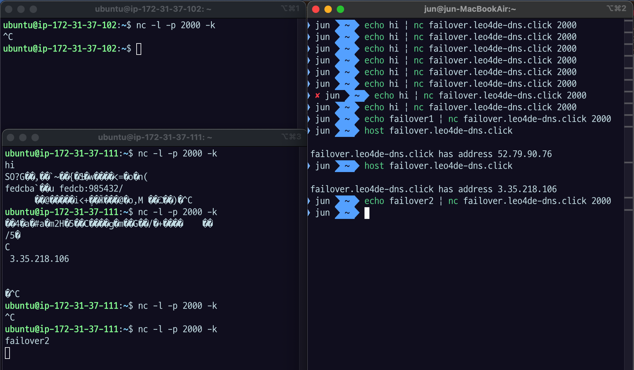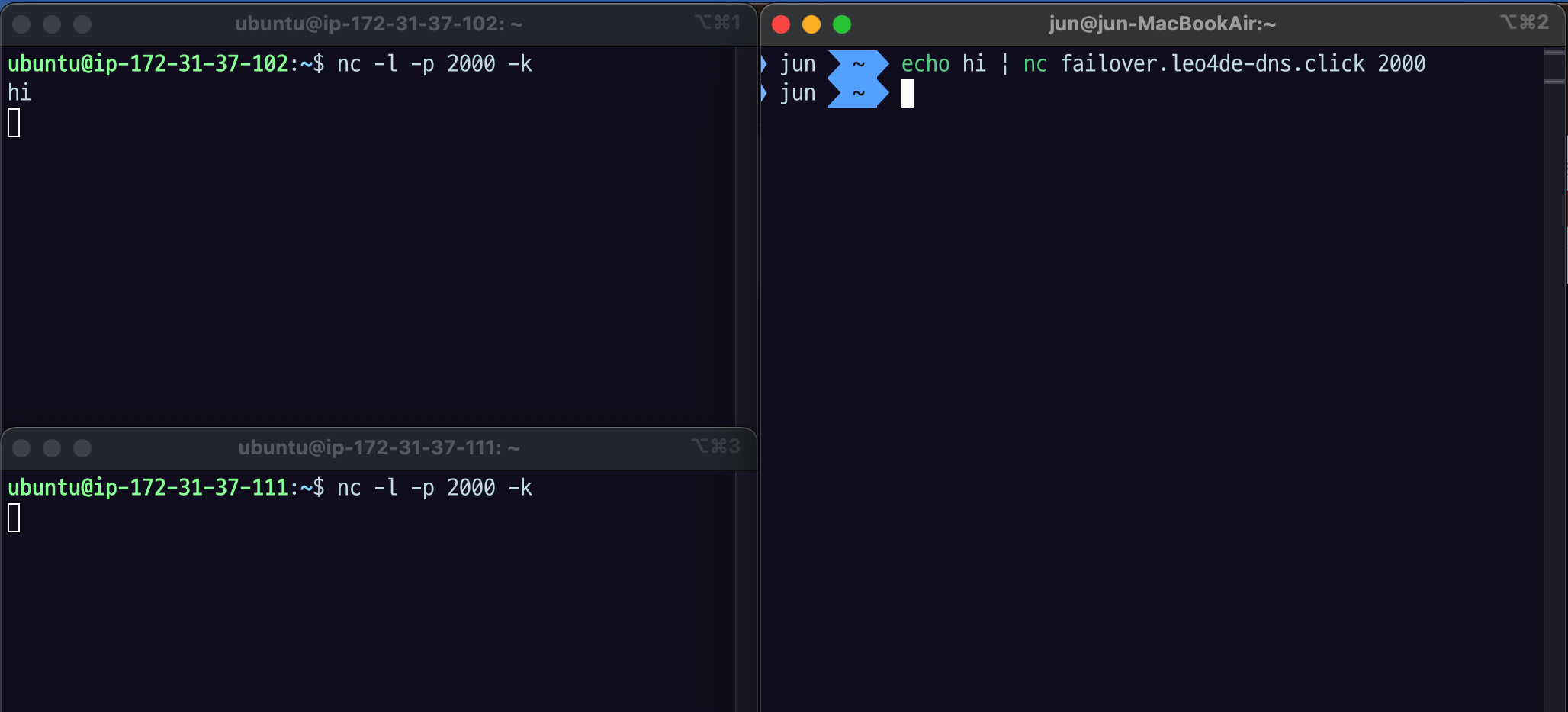 echo hi | nc failover.leo4de-dns.click 2000 명령으로 메시지를 보내면, primary 서버에서 해당 메시지를 수신한다.이제 primary의 프로세스를 ctrl + c로 죽인 상태로 failover가 잘 작동하는지 확인해보자.