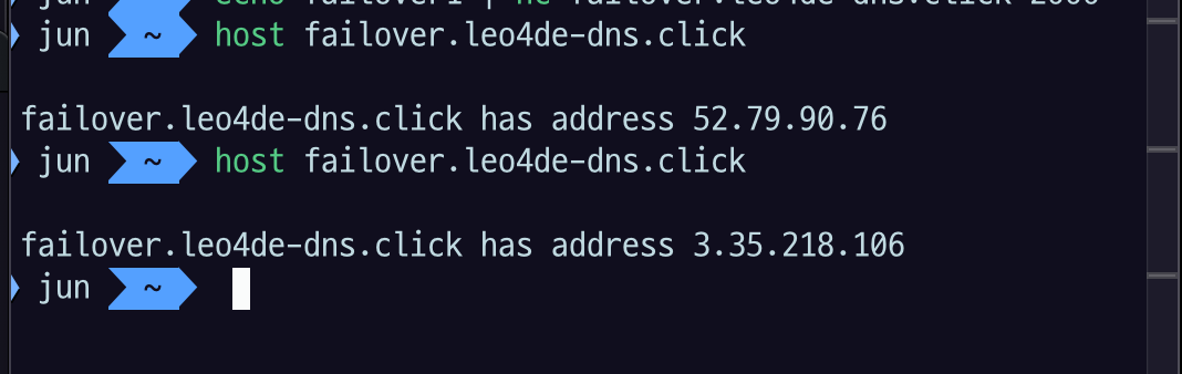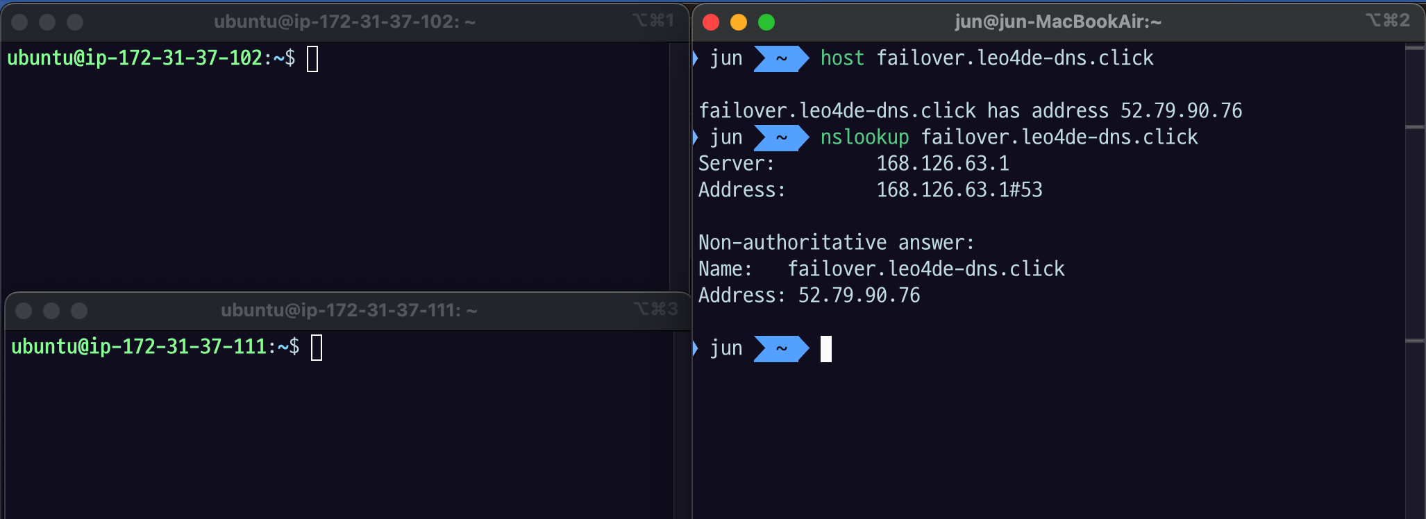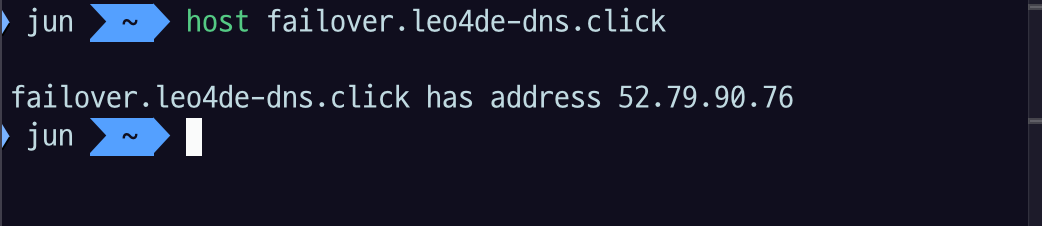 host failover.leo4de-dns.click 명령어를 사용하면 현재 활성화된 주소를 확인할 수 있다.52.79.90.76)로 연결된 것을 확인할 수 있다.