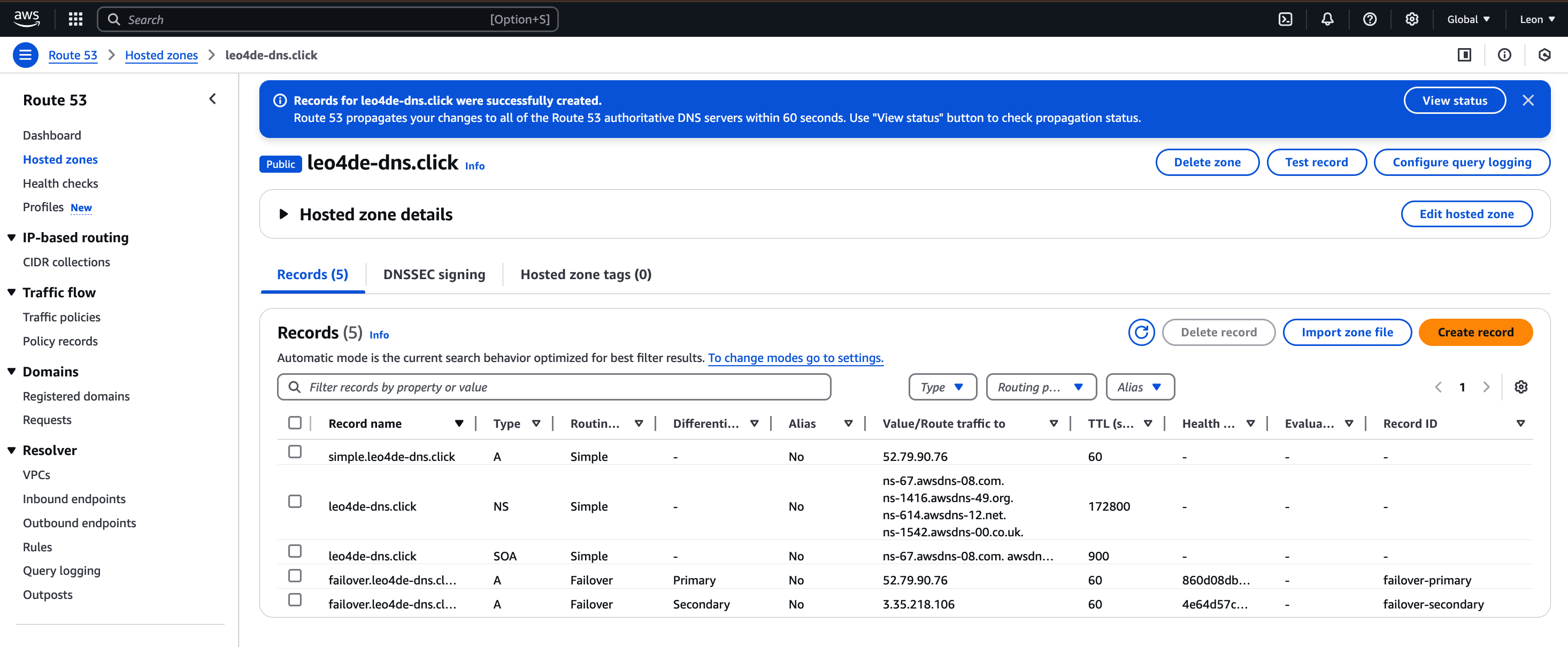 두 개의 Failover 레코드가 성공적으로 생성된 것을 확인할 수 있다.