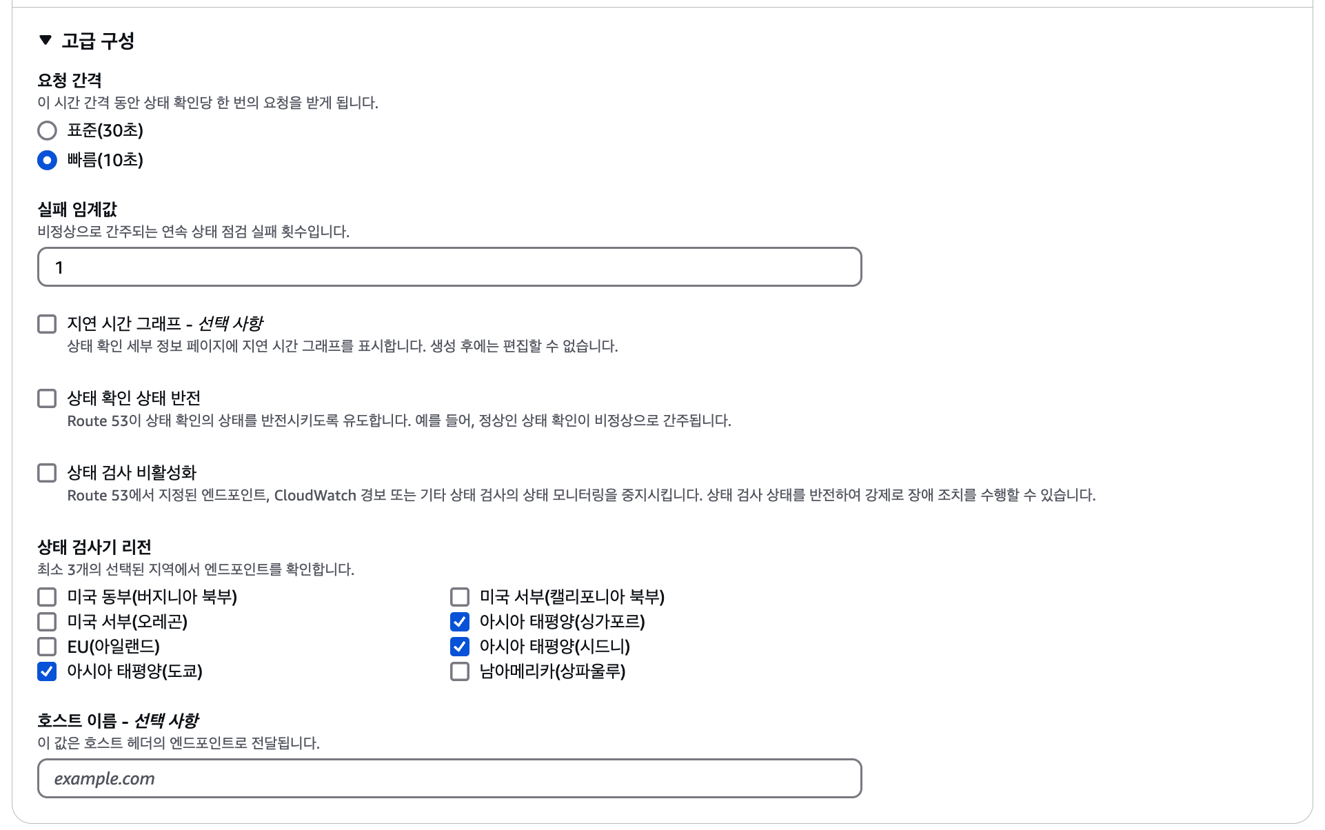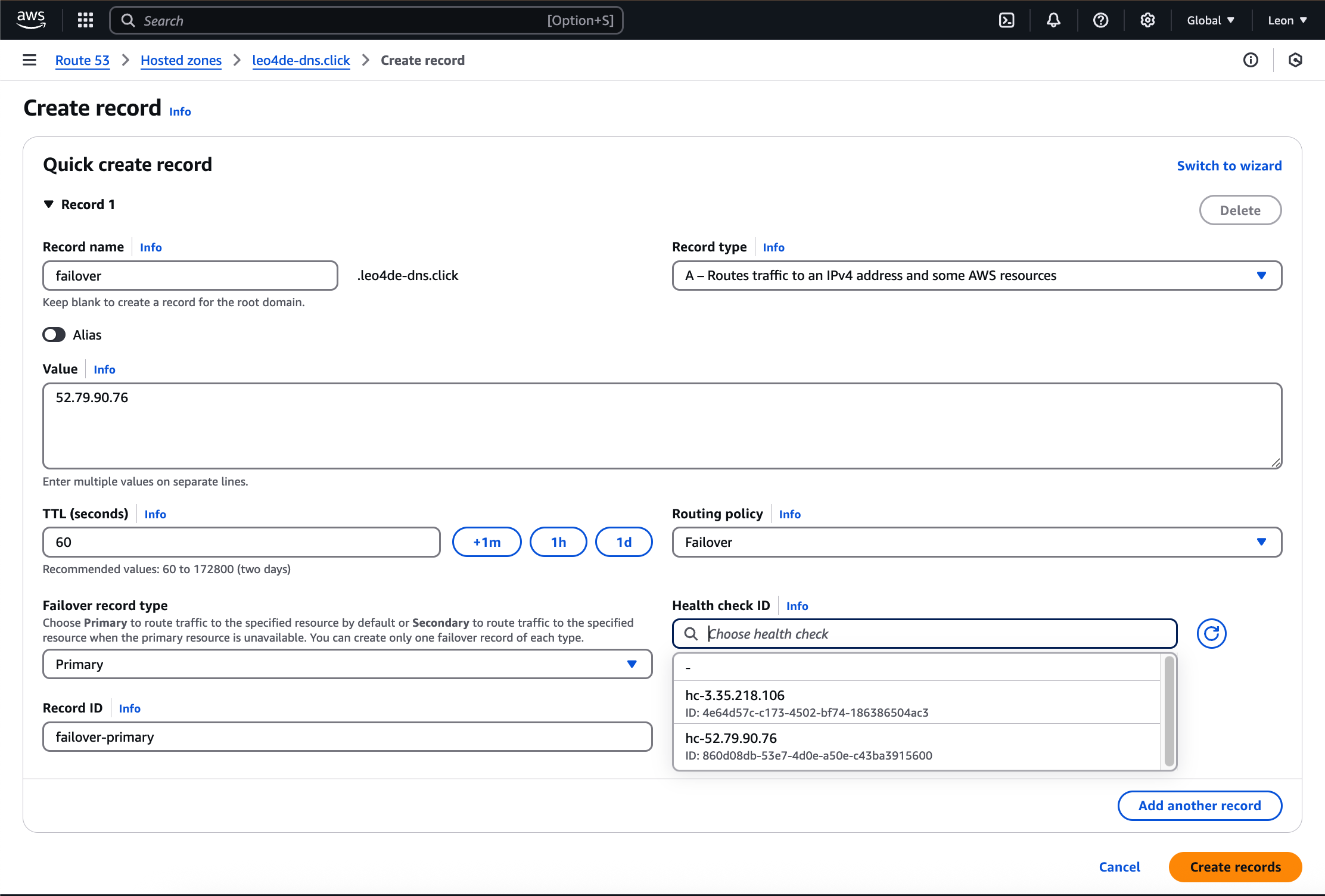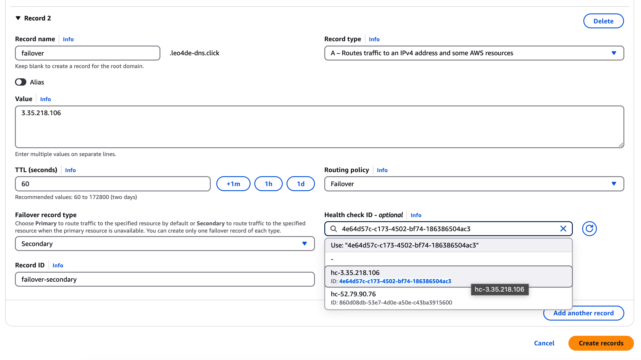 Failover record type은 Primary, secondary 가 있다. Primary 는 가장먼저 연결하는 DNS가 여기에 연결하겠다.라는 거고 헬스체크는 아까 기본 서버의 IP주소로 미리 만들어 둔 헬스체크를 사용한다.