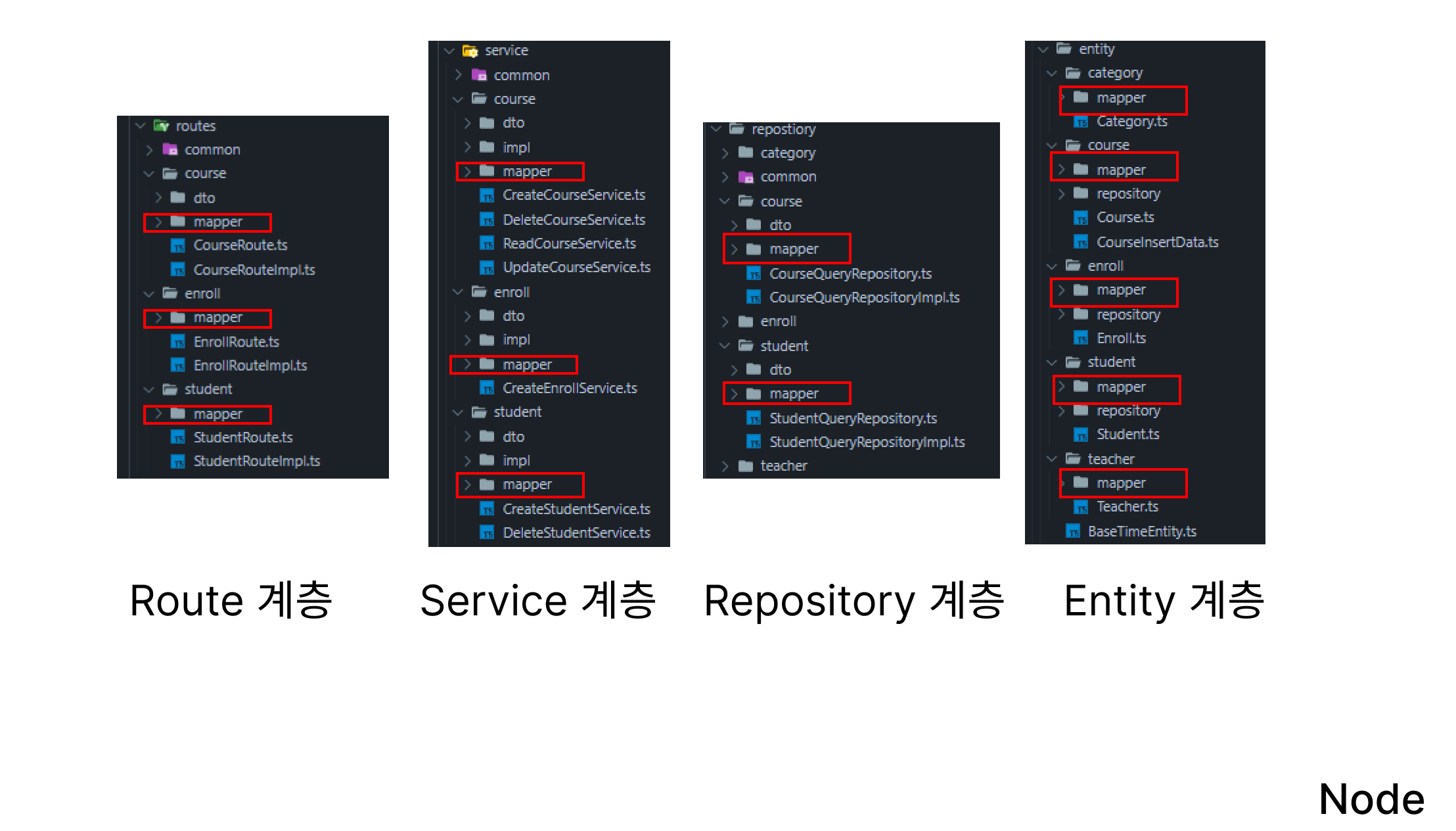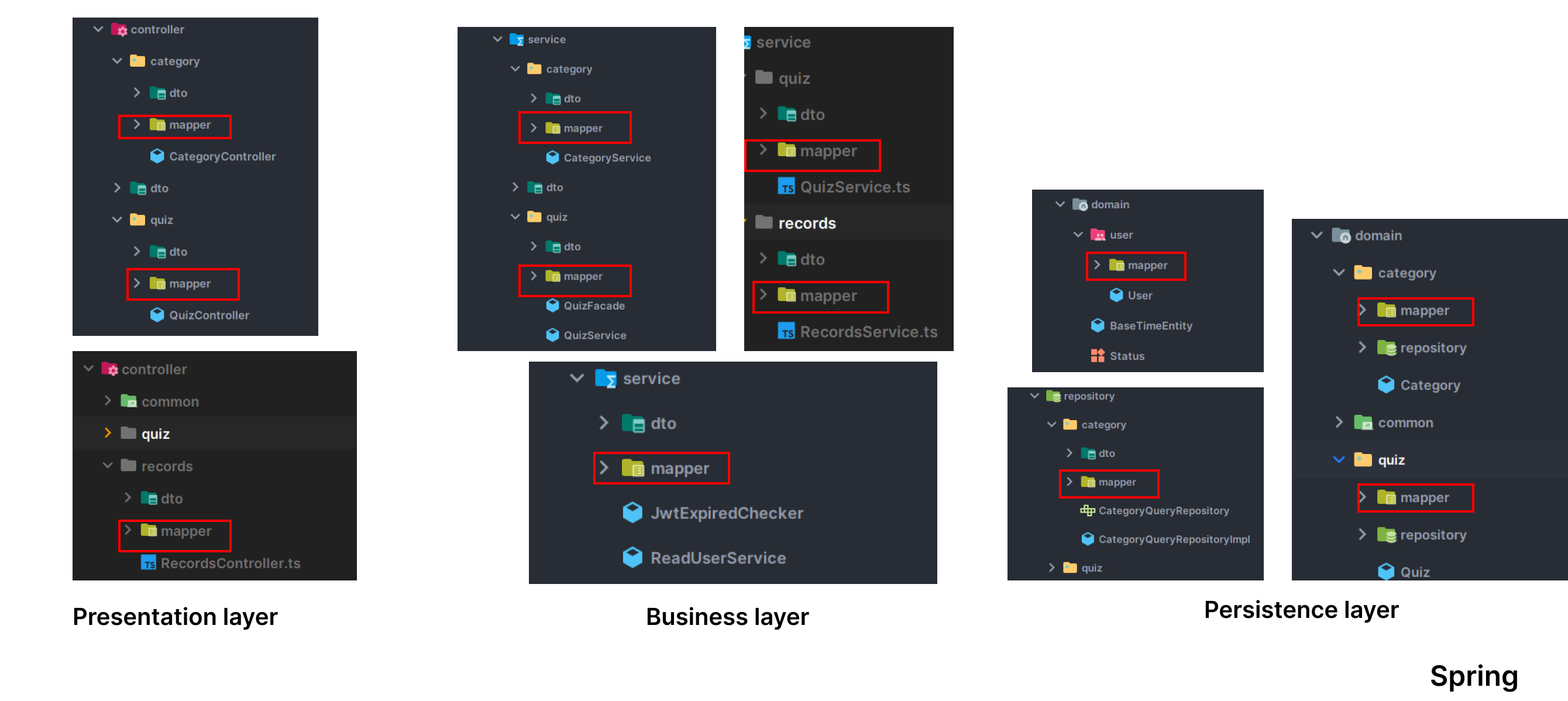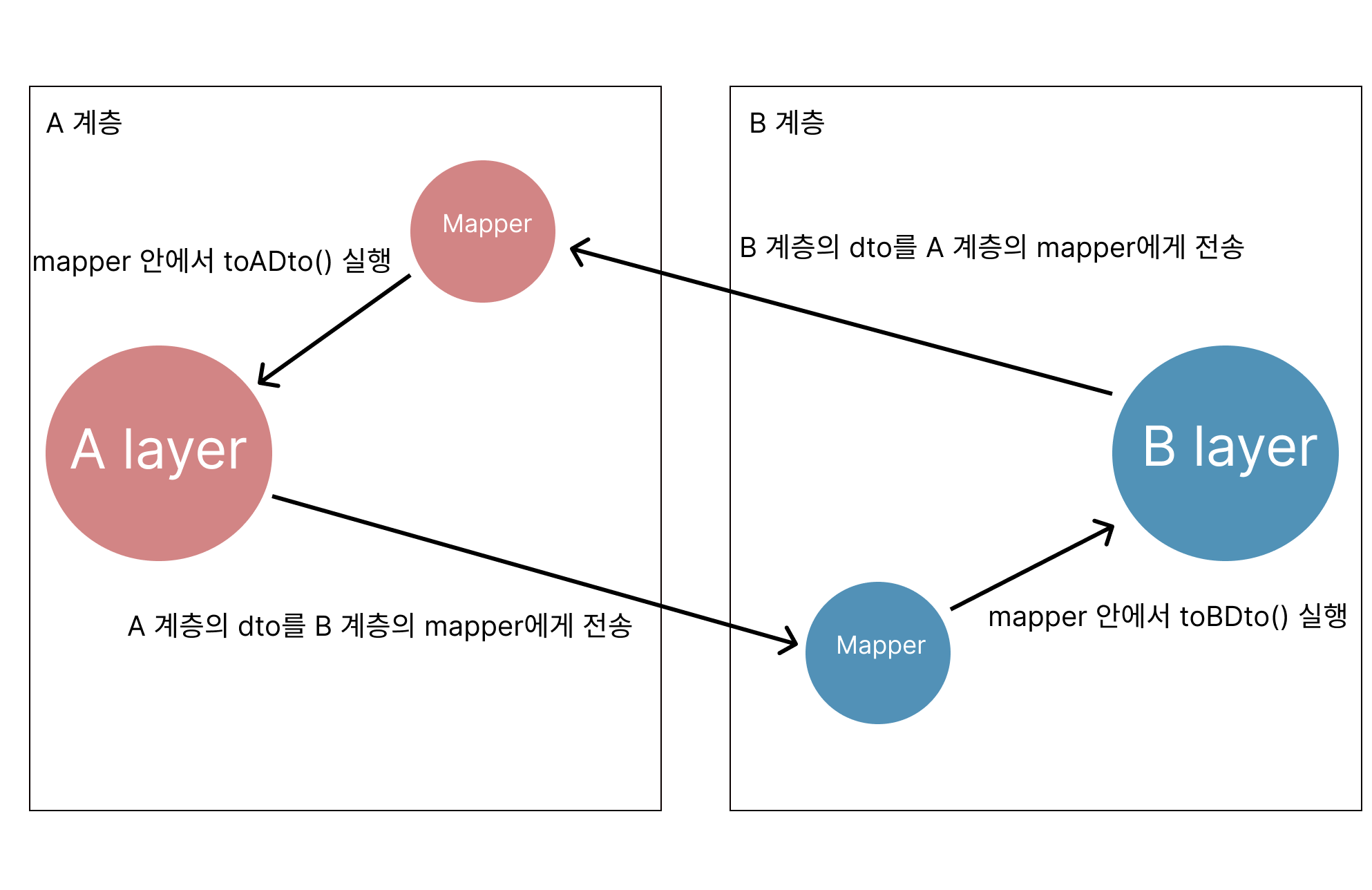이런 고민에 대한 해결책으로, 각 계층의 분리를 확실히 하기 위해 Mapper 객체를 도입하였습니다. Mapper는 계층 간 이동 시 데이터를 해당 계층의 전용 객체(DTO) 또는 엔티티로 변환하는 역할을 수행합니다. 이 방식을 통해 각 데이터는 서로에게 영향을 주지 않고, 해당 데이터에 대한 비즈니스 로직에만 집중할 수 있게 되었습니다. 또한, 데이터의 불변성도 확보할 수 있었습니다.