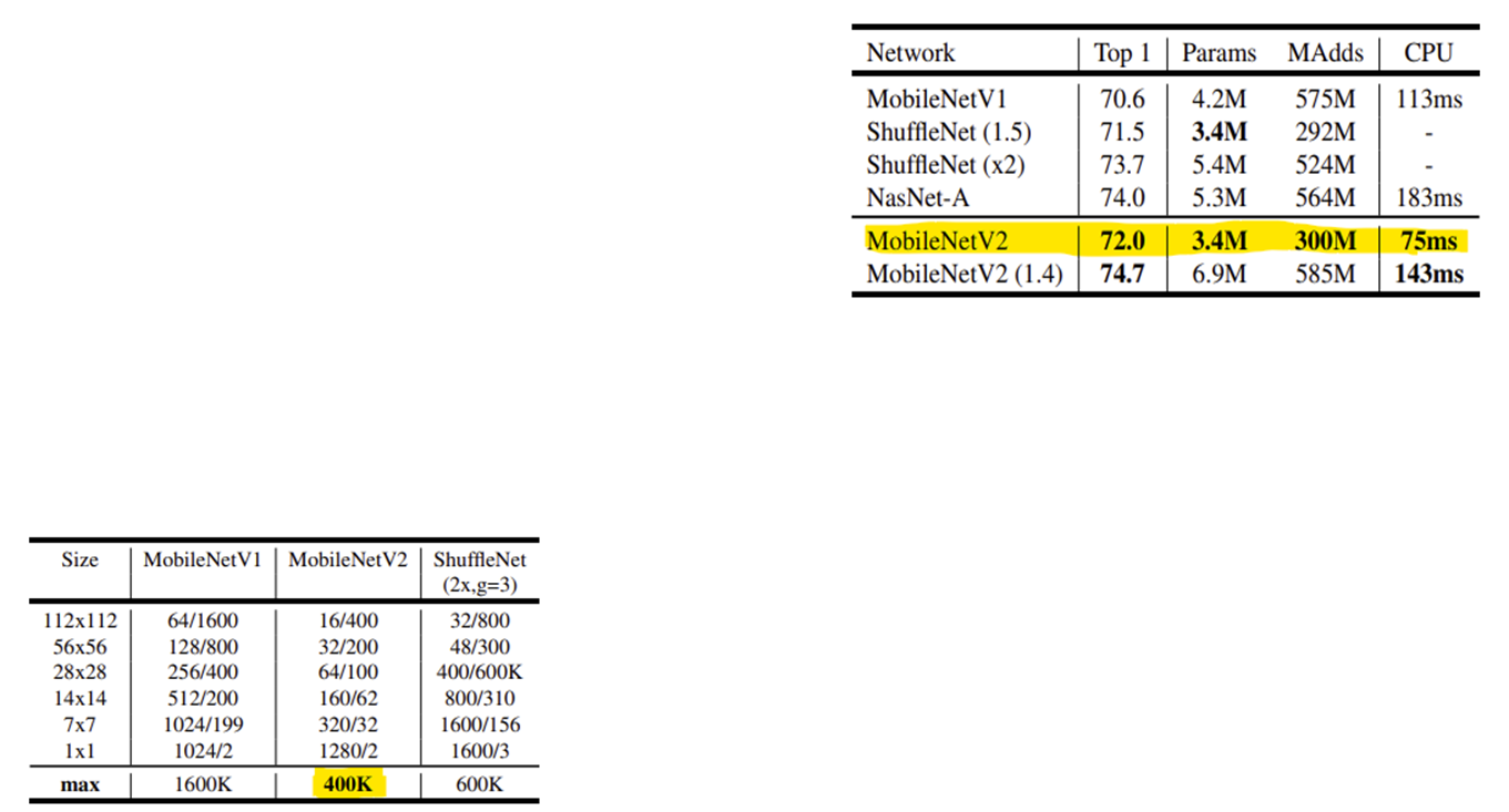따라서 정확도는 유지하면서 메모리는 적게 사용하는 모바일 환경에 적합한 computer vision model인 MobileNetV2를 만들어 내었다는 것.