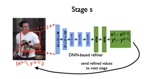 이렇게 구한 좌표 예측값을 토대로 training을 시키는데 initial 모형을 학습하여 Input Image 속 관절의 대략적인 위치를 파악한 후,관절 별로 Stage t 모형에 새로운 Bounding Box를 입력해 예측 값을 산출하고 이를 S번 반복하는 과정을 거치는 과정으로 진행됩니다.