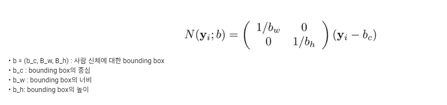 벡터 y_i는 i번째 관절의 x, y 좌표와 중심점 간의 차를 구하고, 각각을 너비와 높이로 나눠 주어 normalize하여 사용합니다.