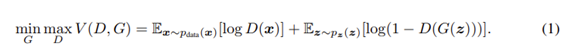 D는 한 장의 이미지가 학습데이터인지 혹은 G로부터 만들어진 이미지인지 구별할 수 있도록 학습이 이루어집니다. 다시말해 G와 D는 일종의 min maxgame을 하는 것. 하나의 목적식이 있을 때 하나는 그식을 최대화 하고 다른 한식은 그 식을 최소화하도록 학습을 진행합니다.