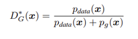 그리고 그림으로 설명했을때는 (a)그림에서 보이는 듯이 처음에는 생성자의 분포가 원본학습데이터의 분포를 잘 학습하지 못하기 때문에 구분된 그래프의 형태로 보여지고 discriminator는 잘 구분해내는 것을 볼 수 있고 (a)에서 (d)까지 이루어짐에 따라 학습이 잘 이루어진 (d)를 보면 생성자의 분포가 원본데이터의 분포를 잘 따라가는 것을 볼 수 있으며 discriminator와 같은 경우는 가짜이미지와 진짜이미지를 구분할 수 없기 때문에 아래 식에 의해 pg= pdata이므로 1/2로 수렴하는 것을 확인할 수 있었습니다.