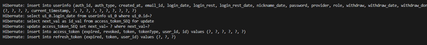 해당 메서드에서는 빌더 패턴을 통해 각 속성 값이 등록되고, 이를 통해 UserRepository를 거쳐 DB에 저장 됩니다. 이후 accessToken와 refreshToken을 생성하여, 역시 DB에 저장합니다.