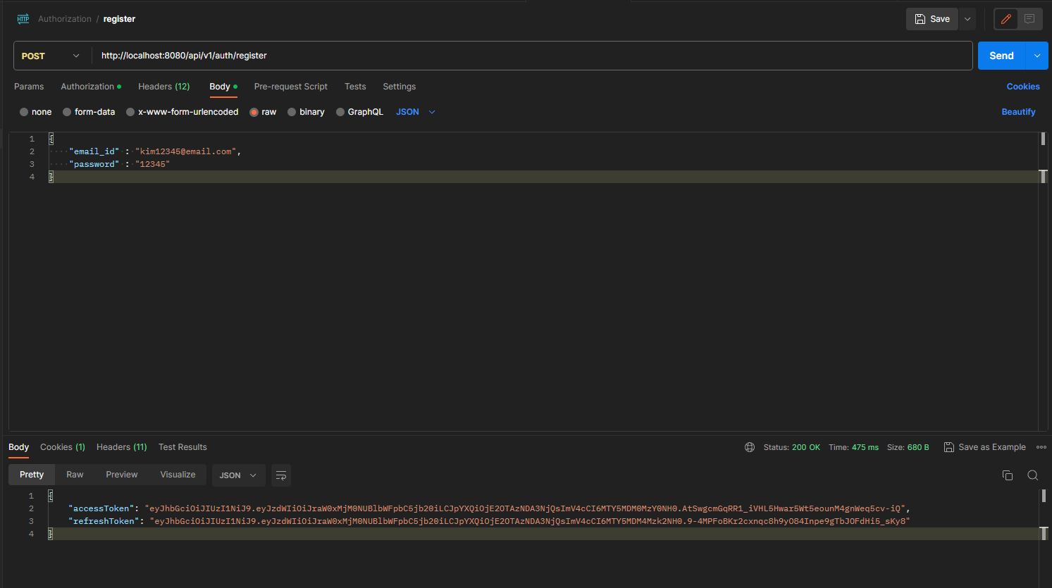 모든 프로세스가 끝나면, 해당 메서드는 acceeToken과 refreshToken을 빌더패턴으로 등록해 responseEntity로 아래와 같이 클라이언트에게 응답합니다.