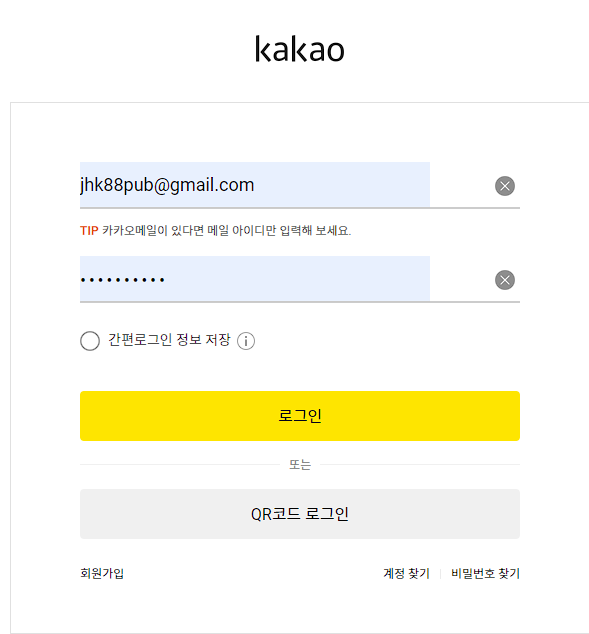 Postman이 아닌, 웹 브라우저로 KakaoCallback의 URL를 요청하면 카카오 로그인으로 리다이렉트 됩니다. 카카오에 가입된 회원정보를 입력하고 로그인 합니다.