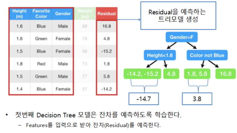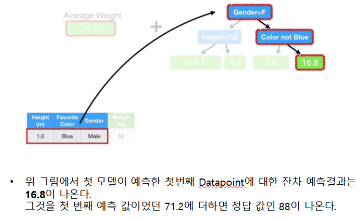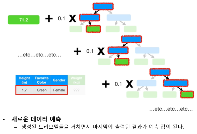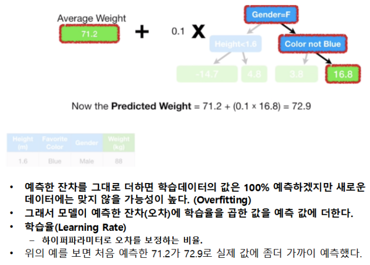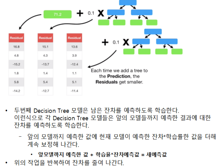 정확도가 낮은 하나의 모델을 만들어 학습 시킨뒤, 그 모델의 예측 오류는 두 번째 모델이 보완한다. 이 두 모델을 합치면 처음보다는 정확한 모델이 만들어 진다. 합쳐진 모델의 예측 오류는 다음 모델에서 보완하여 계속 더하는 과정을 반복한다. 즉 약한 학습기들은 앞 학습기가 만든 오류를 줄이는 방향으로 학습한다