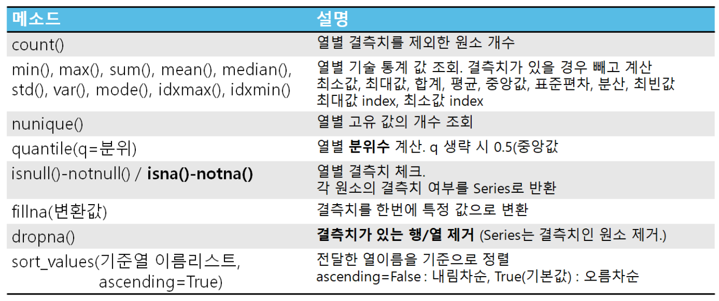 .sort_values()/sort_index() : 값(sort_values)/index명(sort_index)을 기준으로 정렬. ascending=False :내림차순, True가 기본(오름차순)