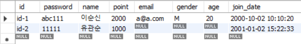 -- 테이블을 삭제했으므로 테이블 생성을 다시 해줌. -- 데이터를 추가 (insert문 - 행추가) -- 전체 컬럼에 다 값을 넣을 경우 컬럼명은 생략 가능. -- 문자열 : ''로 감싼다. -- 일시 : ''로 감싼다. '년-월-일 시:분:초' insert into member values ('id-1', 'abc111', '이순신', 2000, 'a@a.com', 'M', 20, '2000-10-02 10:10:20');insert into member (id, password, name, join_date) values ('id-2', '11111', '유관순', '2001-01-02 15:22:33');select * from member;