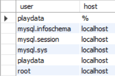 -- localhost : 로컬로 접속할 수 있는 계정 create user 'playdata'@'localhost' identified by '1111';-- 원격 접속 사용자 계정 create user 'playdata'@'%' identified by '1111';-- 등록된 사용자 계정 조회. select user, host from mysql.user;