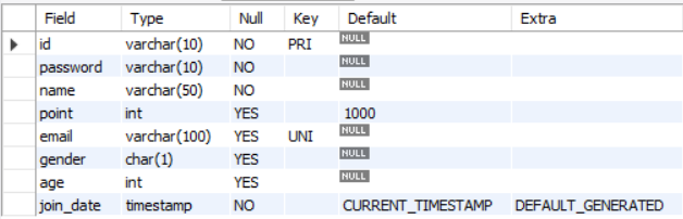 -- 특정 데이터베이스를 사용 use testdb; -- database이름.테이블이름 로 해야되는데 -> use를 하면 database이름을 생략 가능./* create table 이름( 컬럼이름1 데이터타입 제약조건, 컬럼이름2 데이터타입 제약조건, 컬럼이름3 데이터타입 제약조건, 컬럼이름4 데이터타입 제약조건 ) */ use testdb; -- 테이블 : member, 속성 : id, password, name, point, email, gender, age, join_date create table member ( id varchar(10) primary key, password varchar(10) not null, name varchar(50) not null, point int default 1000, -- 값을 넣지 않으면 1000을 기본값으로 넣는다. not null (x) -> null을 허용하는 컬럼.(nullable) email varchar(100) unique, gender char(1) check(gender in ('M', 'F')), age int check(age > 0), join_date timestamp not null default current_timestamp -- 값을 넣는 sql이 실행되는 시점의 일시를 넣는다. );-- 테이블 조회 show tables;