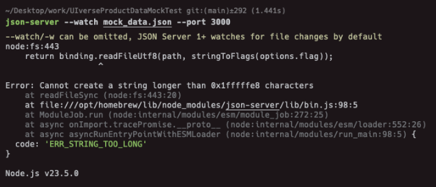 2. 10만 건까지는 VSCode의 JSON-server를 사용했으나, 데이터 양이 증가하자 브라우저에서 모든 데이터를 렌더링할 수 없는 문제가 발생했다. 아래처럼 json파일의 크기가 너무 크다는 에러가 발생한다.