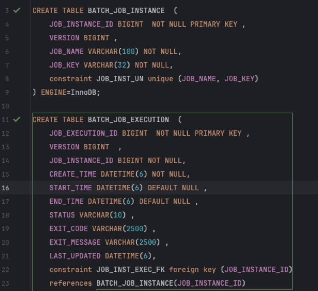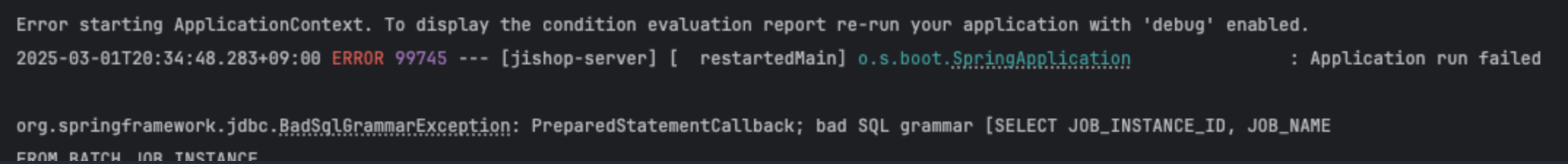 Spring Batch 작업을 실행했을 때 위와 같이 SQL 구문 오류가 발생했다. 특이한 점은 직접 SQL을 작성한 적이 없는데도 SELECT JOB_INSTANCE_ID, JOB_NAME 쿼리 실행 중 오류가 발생했다는 점이다.