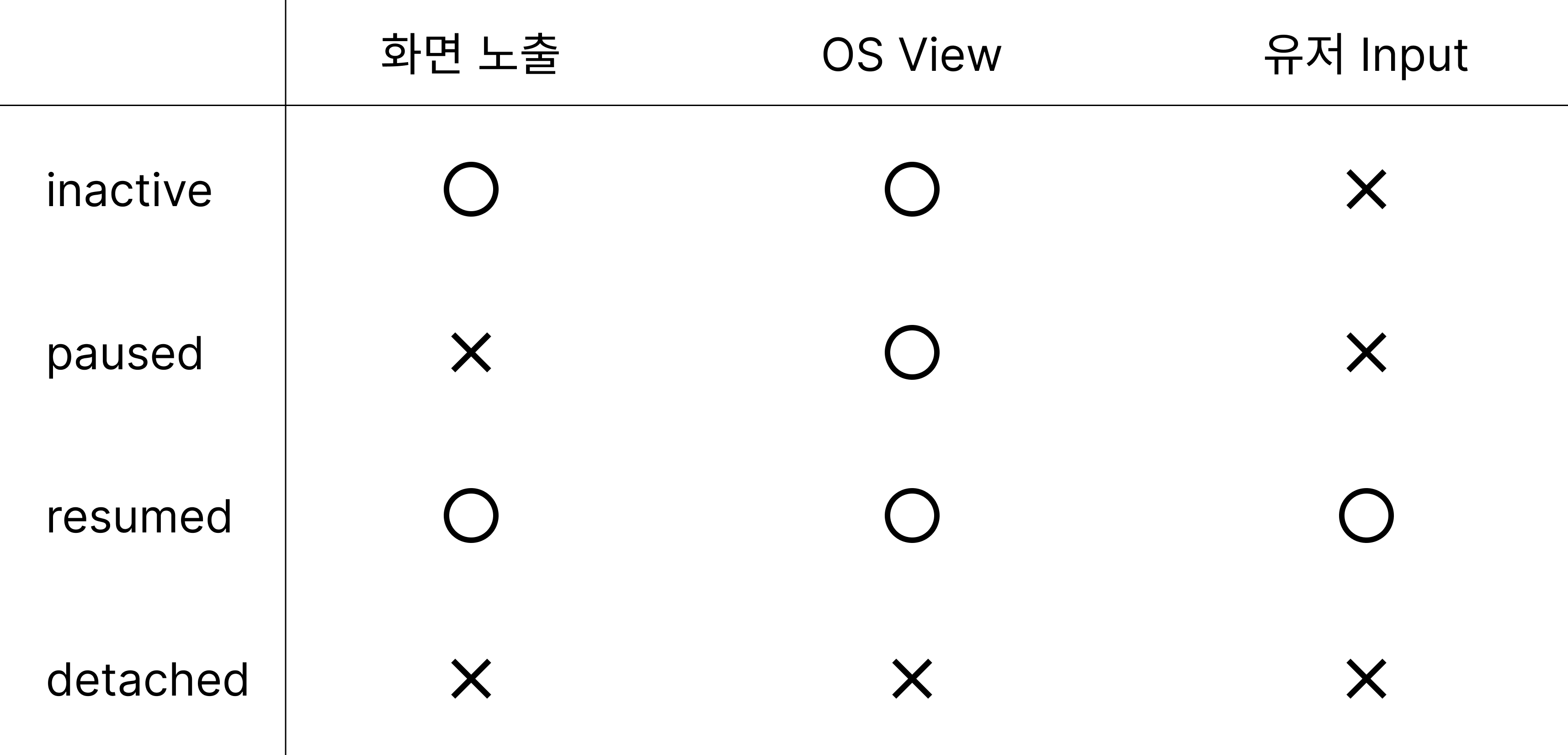 Flutter에서는 앱에서 홈으로 나갔을 때, 전화가 왔을 때, 긴급 문자가 도착하였을 때 등등 앱 라이프사이클 상태가 변하게 된다.
