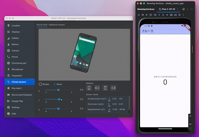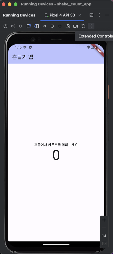 홈 화면에서도 흔들면 숫자가 올라갔다. 만약 백그라운드에서 흔드는 기능을 제어하고 싶다면 WidgetsBindingObserver를 통해 AppLifecycleState를 제어하면 된다.