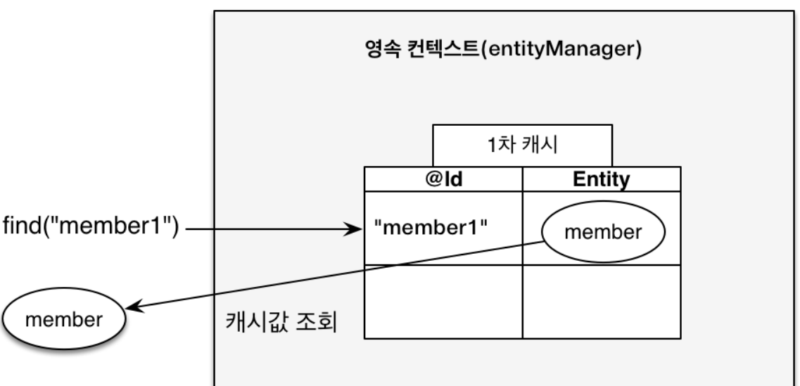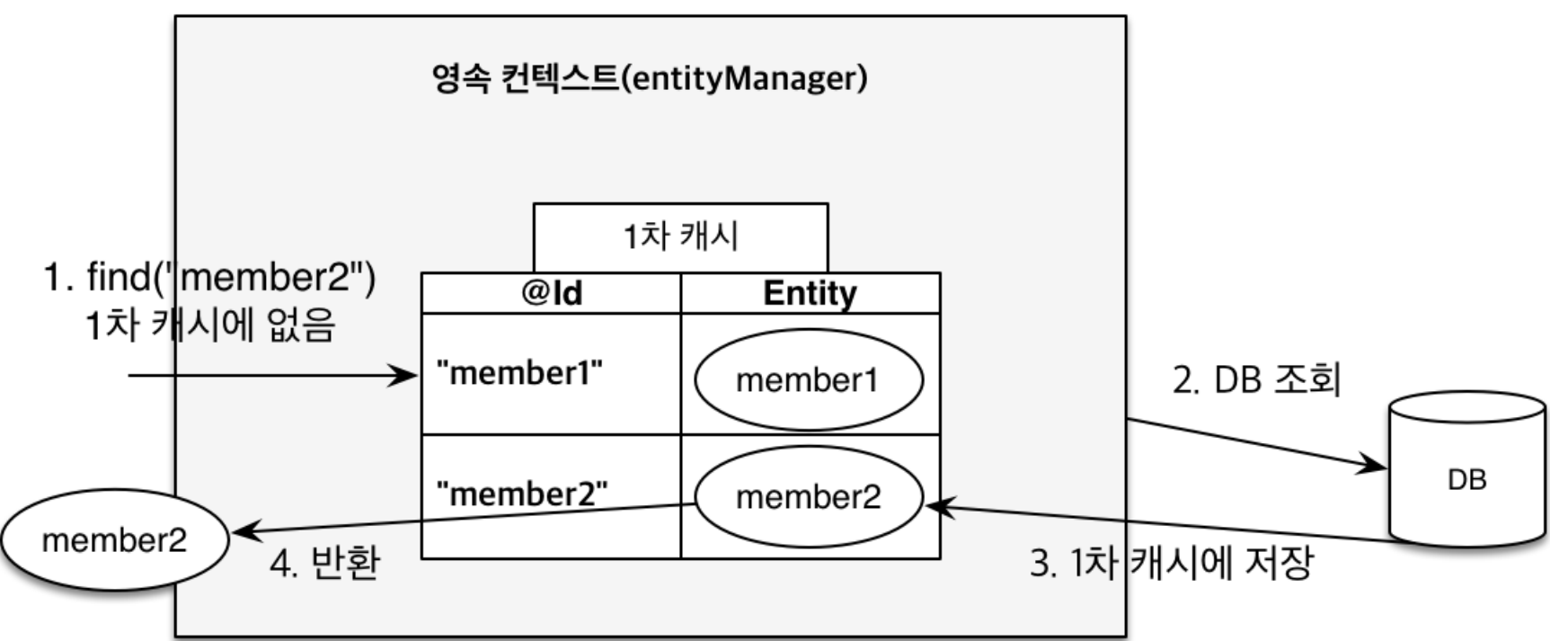 // 1차캐시에 없으면 DB조회 -> 1차캐시 저장 -> Entity반환