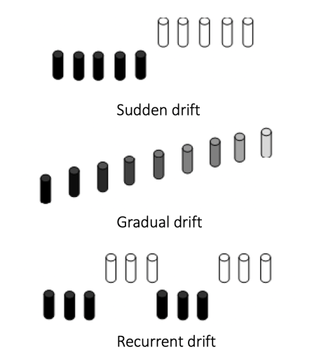 입력 feature와 레이블의 관계가 변화한 경우로, 시간의 흐름에 의존적인 경우에 발생되기 쉽다. 변화 양상에 따라 gradual, sudden, recurrent 세 가지가 있다.