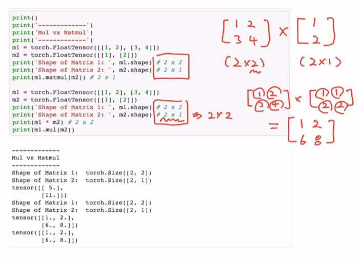 코드에서 알 수 있듯이 Matmul을 사용하게 되면 일반 mul과는 달리 행렬 곱을 실행하게 됩니다.
