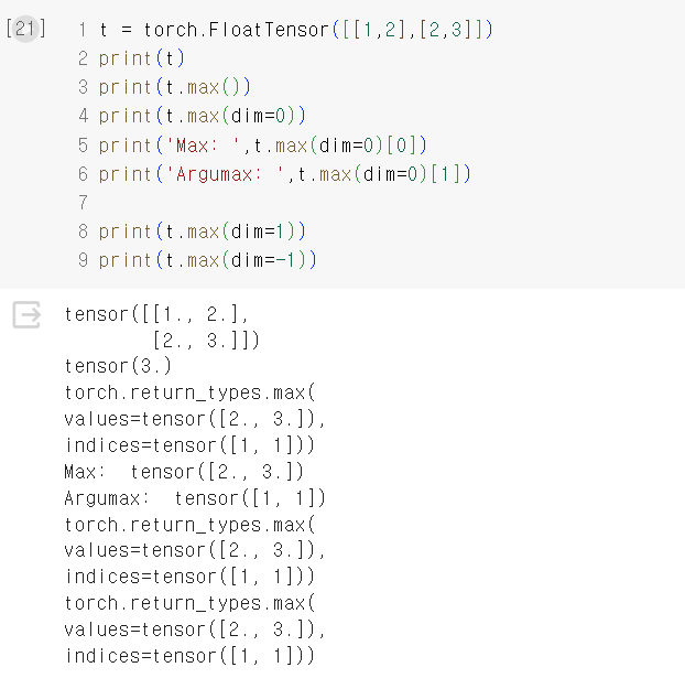 Tensor 중 인덱스 값 중에서 최대값 및 인덱스 값을 리턴해줍니다.