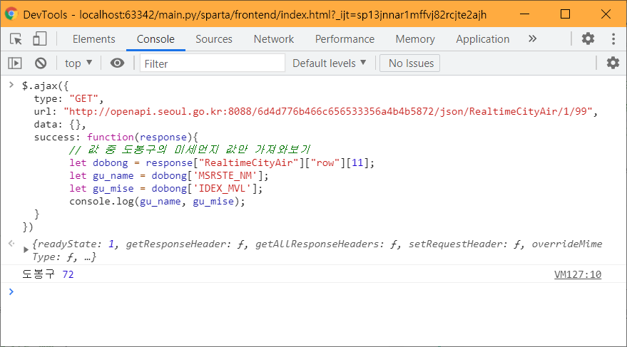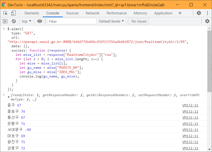 $.ajax({ type: "GET", url: "http://openapi.seoul.go.kr:8088/6d4d776b466c656533356a4b4b5872/json/RealtimeCityAir/1/99", data: {}, success: function(response){ // 값 중 도봉구의 미세먼지 값만 가져와보기 let dobong = response["RealtimeCityAir"]["row"][11]; let gu_name = dobong['MSRSTE_NM']; let gu_mise = dobong['IDEX_MVL']; console.log(gu_name, gu_mise); } })