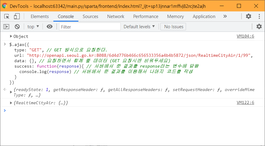 $.ajax({ type: "GET", // GET 방식으로 요청한다. url: "http://openapi.seoul.go.kr:8088/6d4d776b466c656533356a4b4b5872/json/RealtimeCityAir/1/99", data: {}, // 요청하면서 함께 줄 데이터 (GET 요청시엔 비워두세요) success: function(response){ // 서버에서 준 결과를 response라는 변수에 담음 console.log(response) // 서버에서 준 결과를 이용해서 나머지 코드를 작성 } })