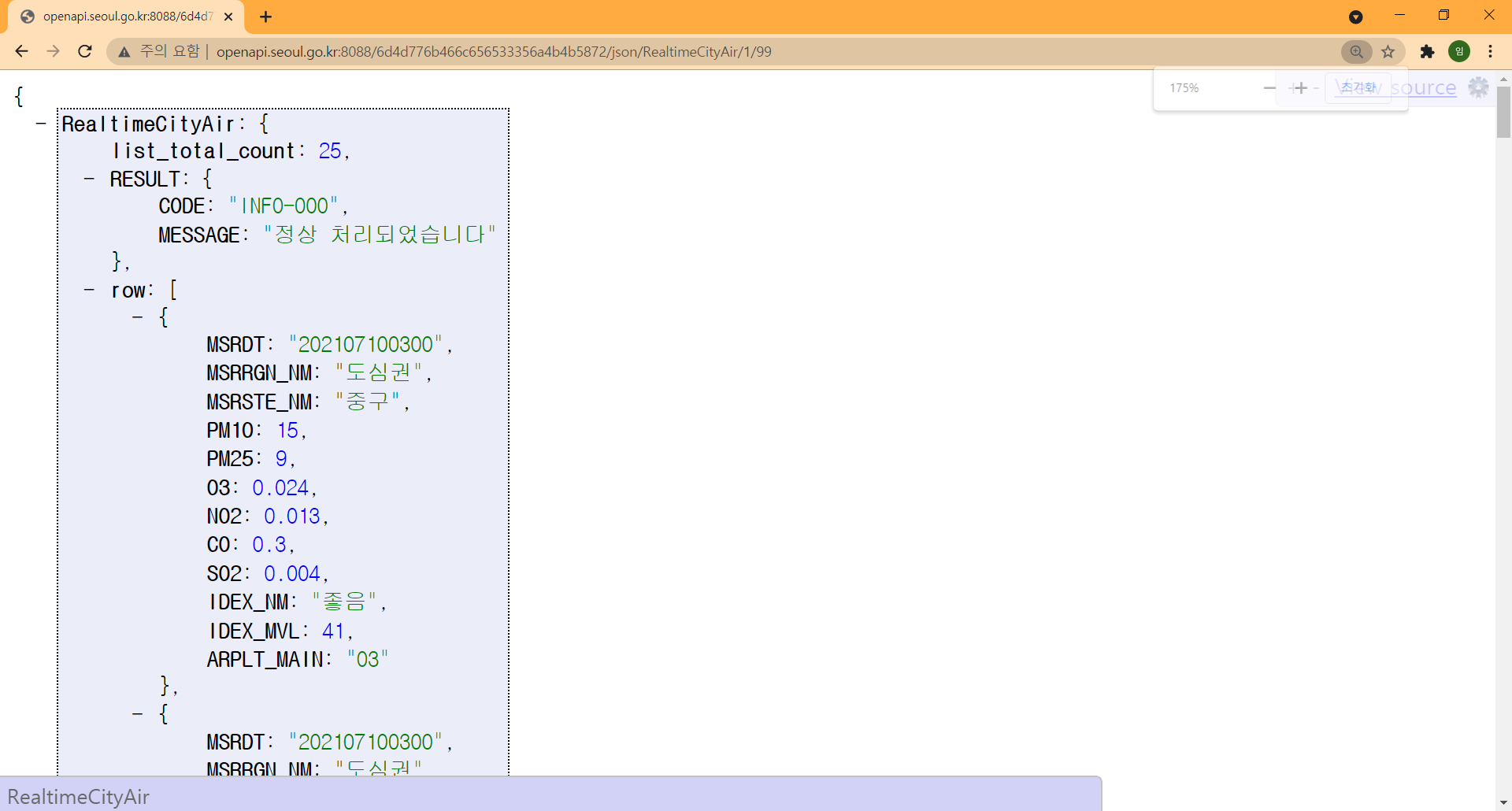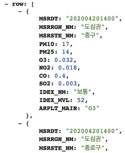 $.ajax({ type: "GET", url: "http://openapi.seoul.go.kr:8088/6d4d776b466c656533356a4b4b5872/json/RealtimeCityAir/1/99", data: {}, success: function (response) { let mise_list = response["RealtimeCityAir"]["row"]; for (let i = 0; i < mise_list.length; i++) { let mise = mise_list[i]; let gu_name = mise["MSRSTE_NM"]; let gu_mise = mise["IDEX_MVL"]; console.log(gu_name, gu_mise); } } });