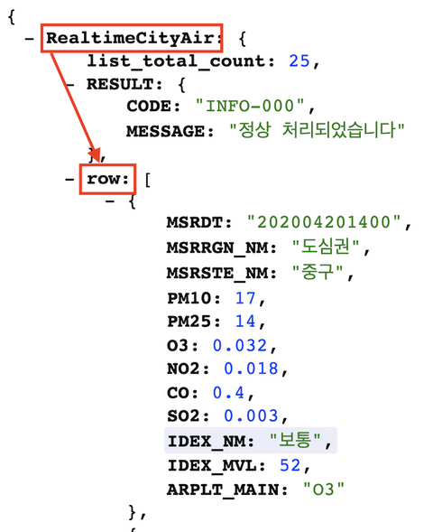 $.ajax({ type: "GET", url: "http://openapi.seoul.go.kr:8088/6d4d776b466c656533356a4b4b5872/json/RealtimeCityAir/1/99", data: {}, success: function(response){ let mise_list = response["RealtimeCityAir"]["row"]; // 꺼내는 부분! console.log(mise_list); } })