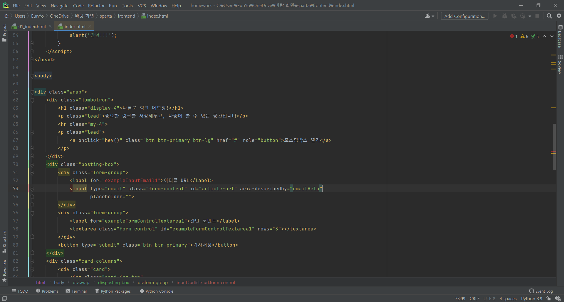 <h5>[완성본]1-2. 버튼을 눌렀을 때 칸에 아무것도 없으면 "입력하세요!" 얼럿 띄우기</h5>