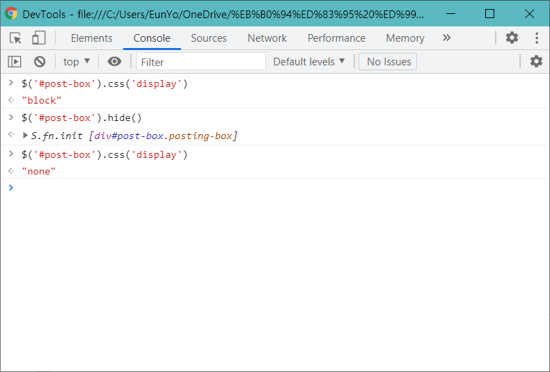 id 값 post-box의 display 값이 block 이면 post-box를 가리고 글씨는 열기로 바꿔주고, 아니면 post-box를 나타내면서 글씨는 닫기로 바꿔둔다.