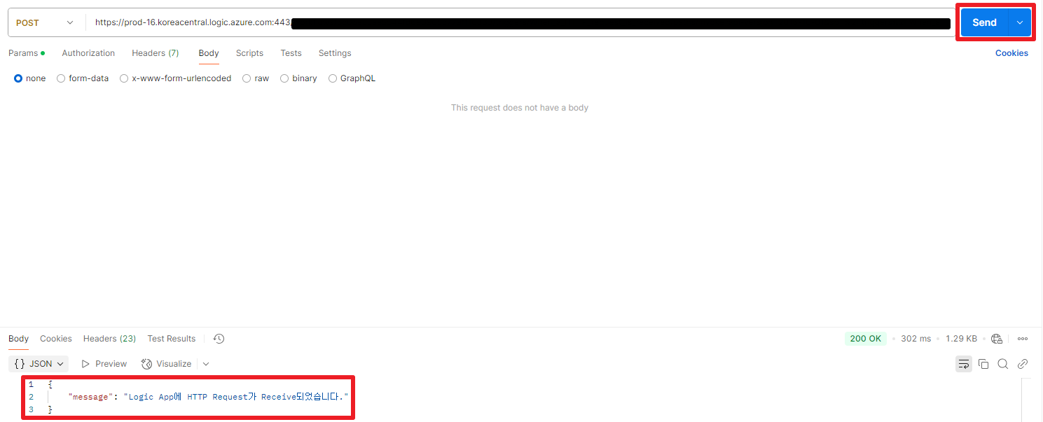 Postman으로 When a HTTP request is received의 URL로 HTTP Request를 Send합니다.