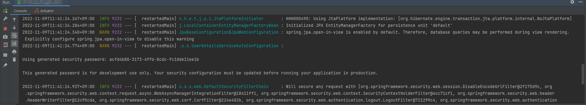 This generated password is for development use only. Your security configuration must be updated before running your application in production.