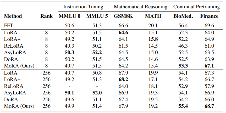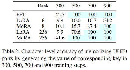 위의 talbe 2를 LoRA와 비교하여 MoRA의 기억 향상 성능이 크게 증가한 것을 확인할 수 있습니다.