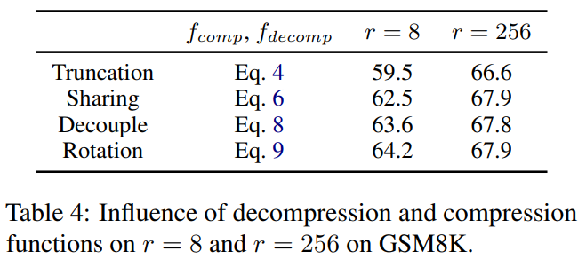 decompression and compression functions in MoRA의 영향을 판단하기 위해 다양한 방법(truncation, sharing, decoupling, and rotation)을 사용한 성능을 위의 표에 제공합니다.