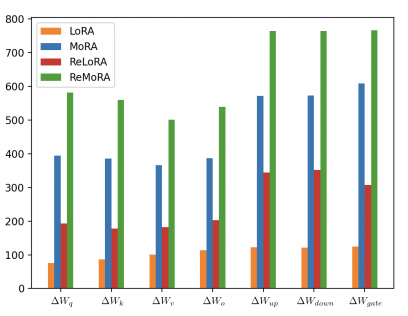 동일한 조건에서 MoRA는 M ∈ R256×256의 square-matrix을 사용하며, rank(∆W) ≤ 256을 따릅니다.