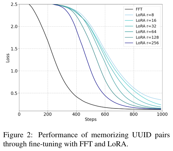 본 논문의 방법을 LoRA 및 FFT와 비교하여 UUID 쌍을 암기하는 작업을 수행했습니다.