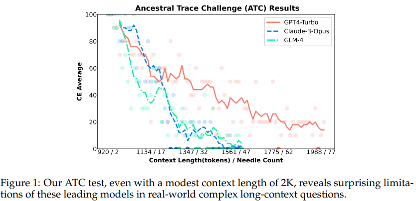복잡한 긴 문맥 작업을 시뮬레이션하기 위해 Ancestral Trace Challenge (ATC) 테스트를 개발했습니다.