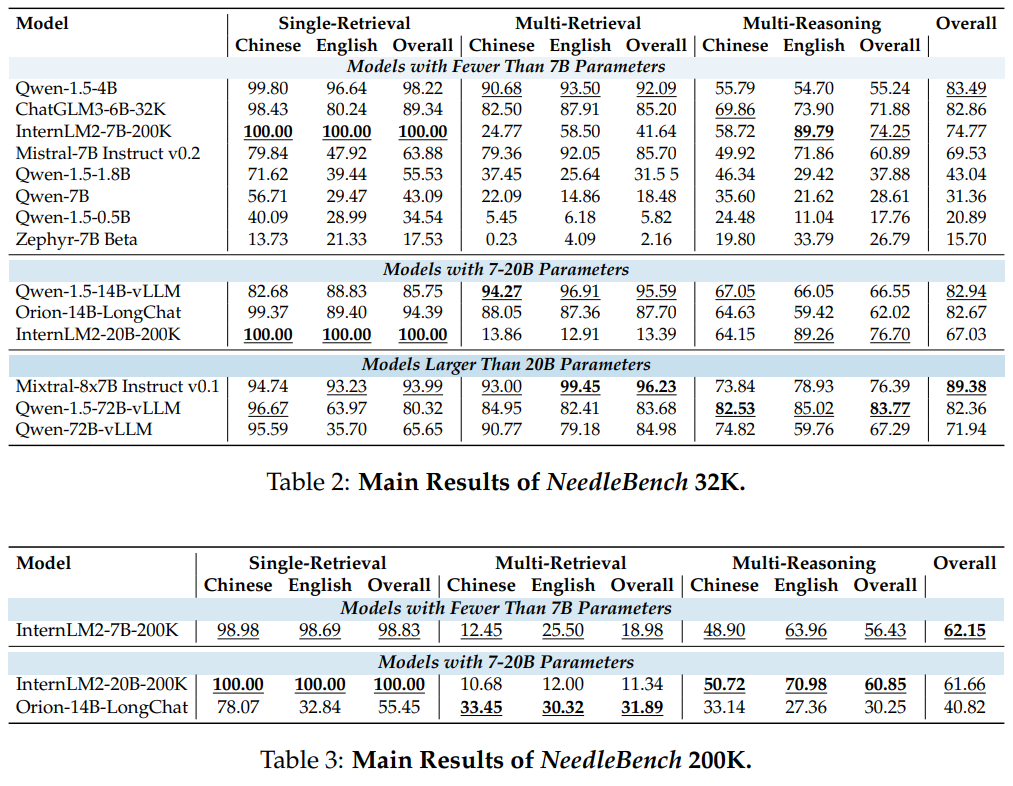 InternLM2-7B-200K: Single-Retrieval에서 완벽한 성과를 달성하여 단일 정보 포인트를 정확하게 검색하는 강력한 능력을 보여줍니다.