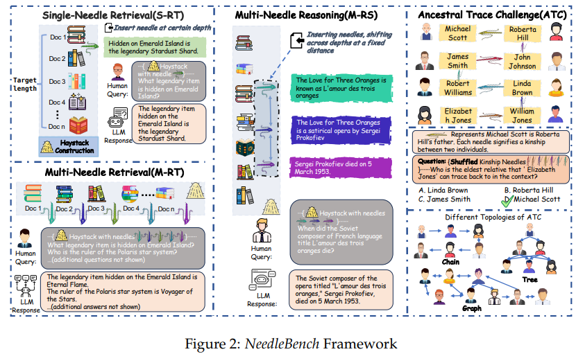 NeedleBench라는 프레임워크를 이용하여 긴 문서에서 사용자 질의를 체크할 수 있는 벤치마크를 소개합니다.