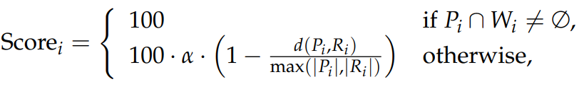 각 특정 작업에서 예측과 참조 간의 유사성을 평가하기 위해, Levenshtein 거리를 사용하며, 와 은 각각 길이가 n인 예측과 참조의 목록을 나타냅니다.