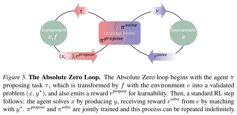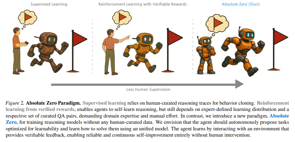 Absolute Zero 패러다임은 모델이 환경과의 상호 작용을 통해 완전히 자체적으로 작업을 생성하고, 해결하고, 학습할 수 있도록 함으로써 이러한 의존성을 제거합니다.